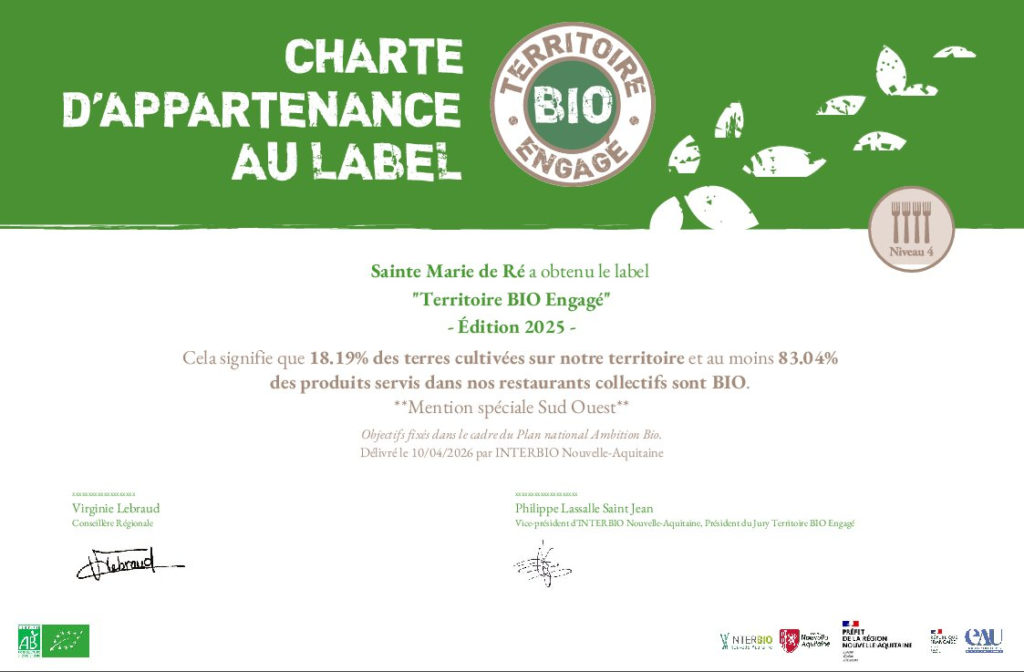 L’école Louis Gaucher est la seule école de l’Ile de Ré à avoir un vrai service de restauration. Une équipe de 4 personnes prépare et confectionne de bons petits plats maisons qui sont à plus de 83,04% bio. Depuis 2013, la commune s’est engagée en signant la charte d’Inter bio Nouvelle-Aquitaine et obtient le label du territoire Bio Engagée. En 2022, Sainte-Marie-de-Ré est reconnue commune la plus « BIO Engagée » de Nouvelle-Aquitaine. Le label a été renouvelé pour l’édition 2025 avec l’obtention du niveau 4 : 18,19% des terres cultivées sur notre territoire et plus de 83,04% des produits servis sont bio.