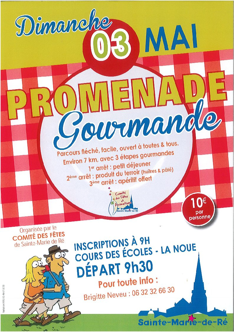 Le Comité des Fêtes de Sainte-Marie de Ré organise sa Promenade Gourmande le dimanche 3 mai. Les inscriptions se feront sur place à 9h, cours des écoles à La Noue, départ à 9h30.
