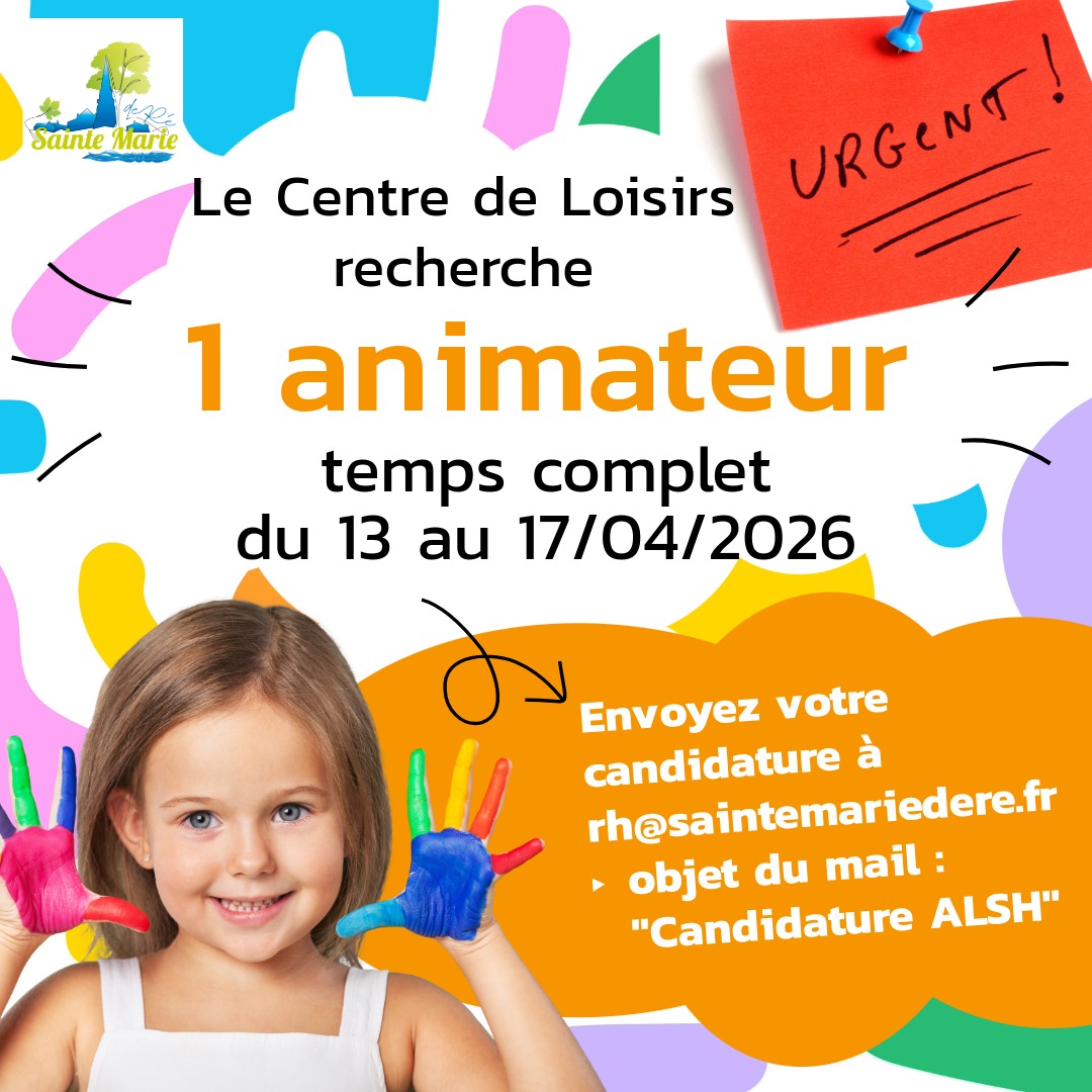 Urgent ! Le Centre de Loisirs de Sainte-Marie de Ré recherche 1 animateur temps complet du 13 au 17 avril 2026.